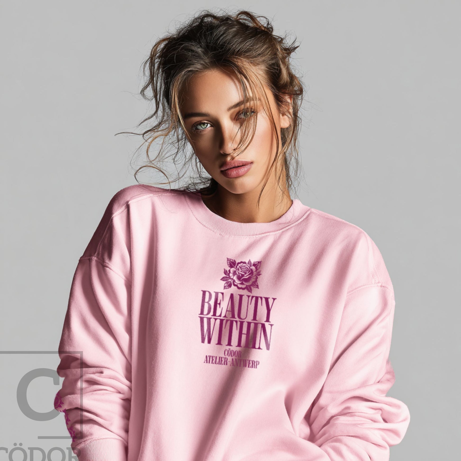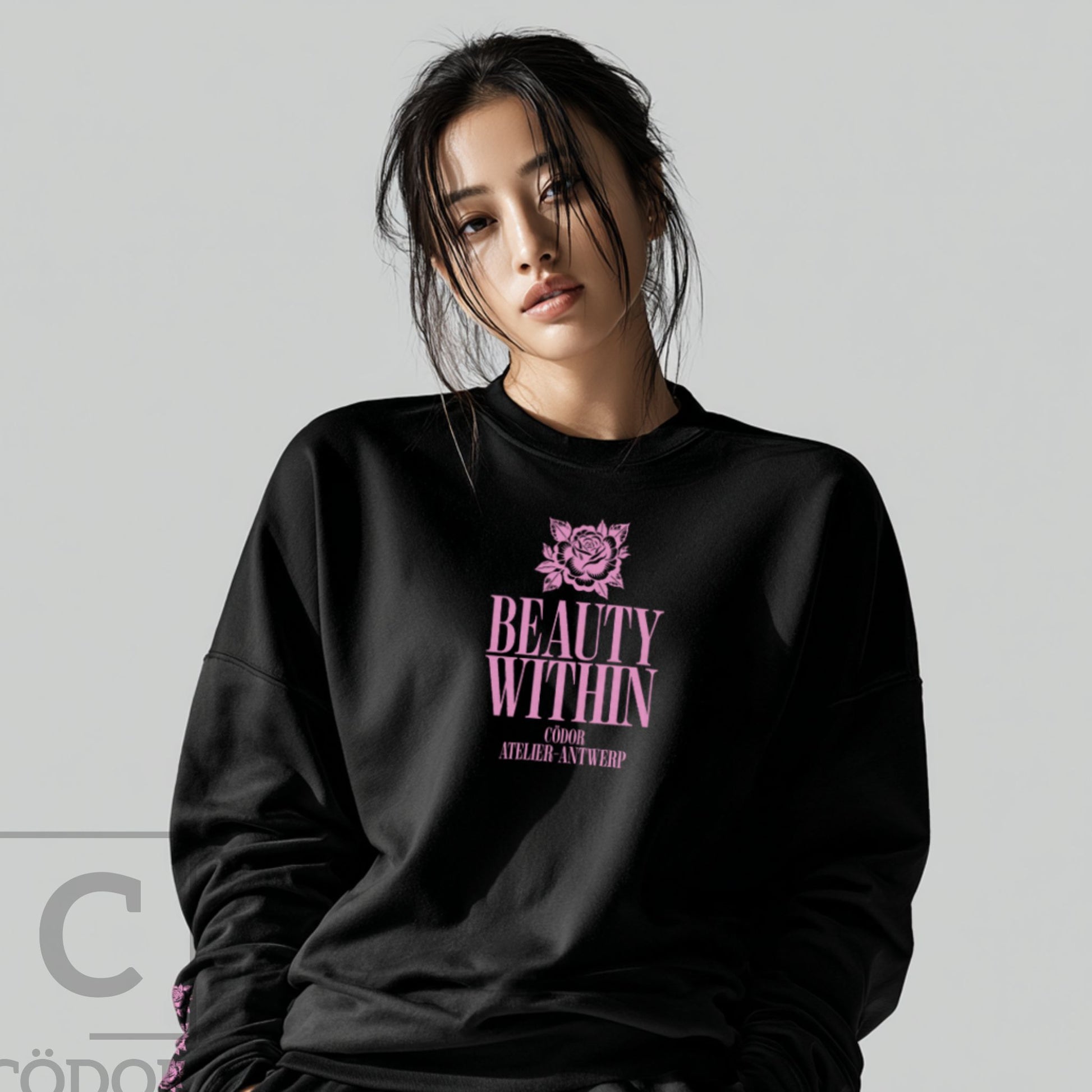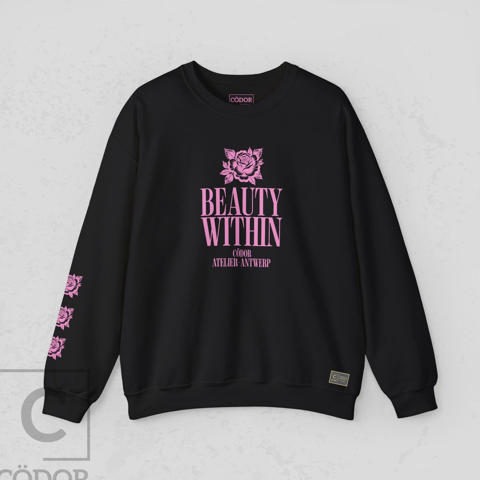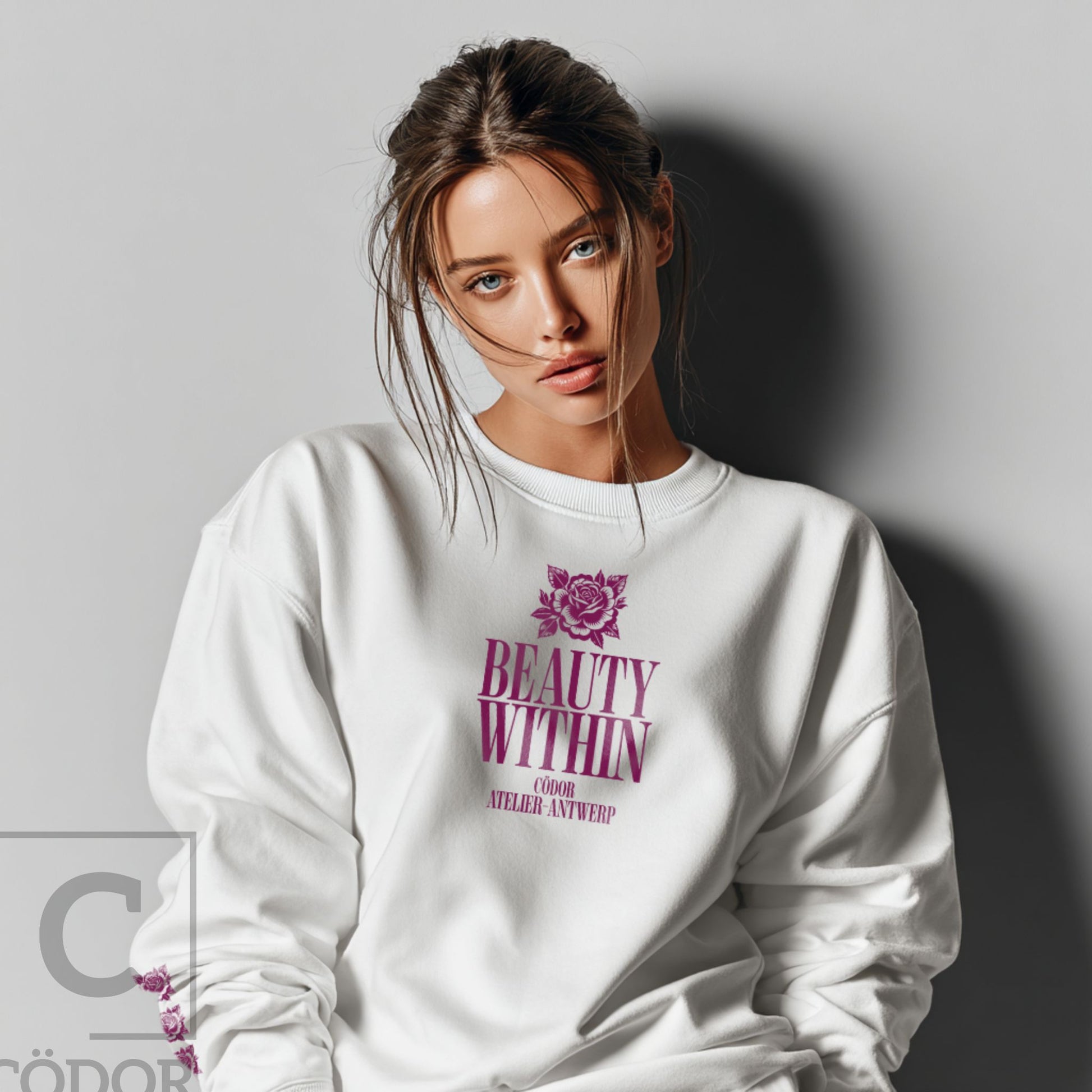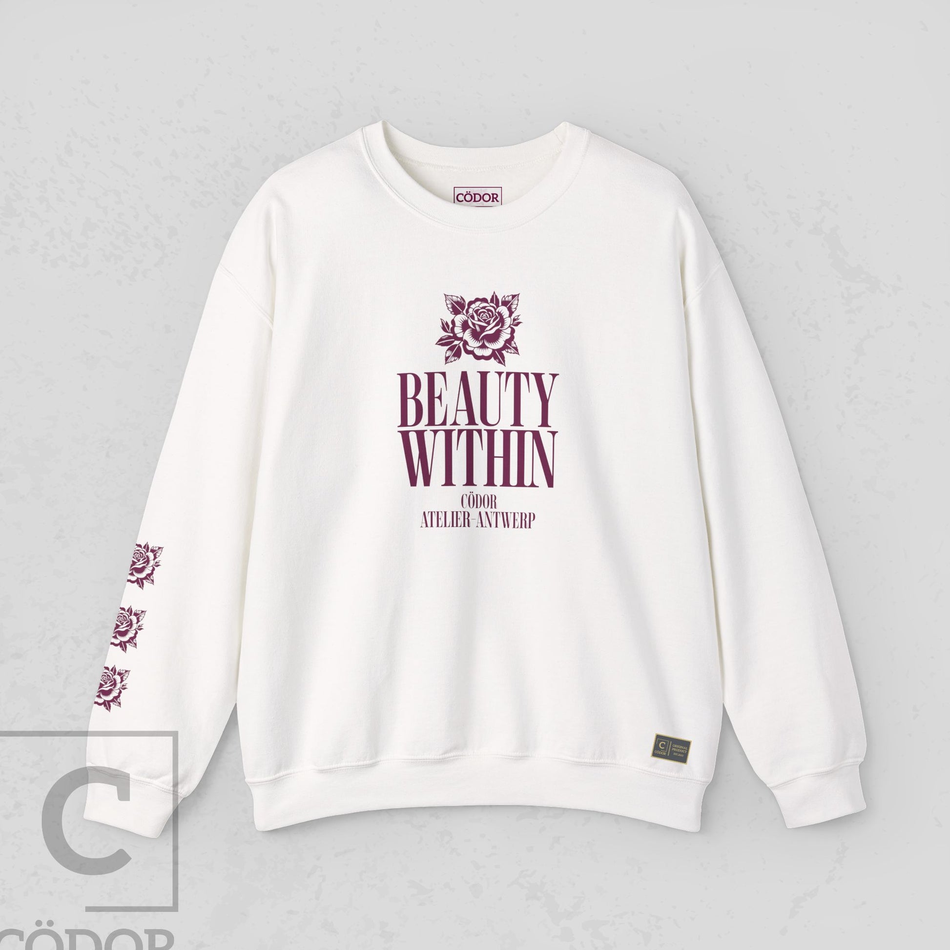 Beauty Within by Cödor translates the brand’s refined aesthetic into a clean, unisex sweatshirt. Defined by a relaxed silhouette and the signature rose motif, the design balances softness with a quiet sense of strength.